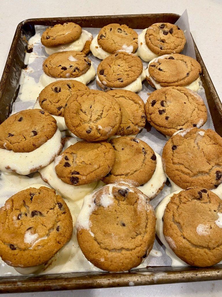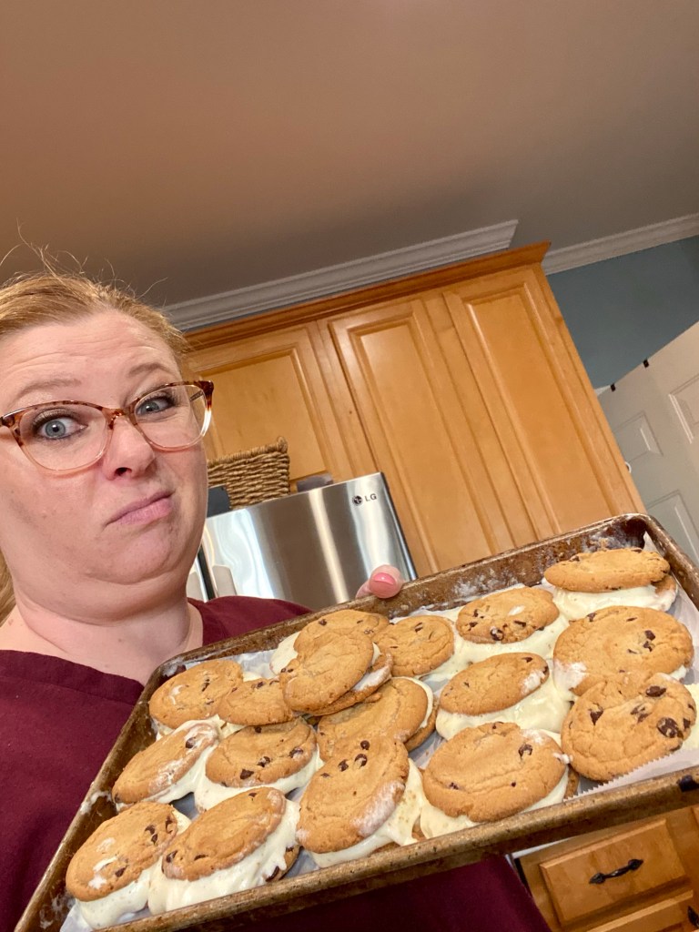 One, why did I let something so small and insignificant fly all over me? Why did it suddenly make me feel like I was a failure at life, completely and totally inadequate? Why did I focus that moment on my failure? That small tiny speck of a moment does not define anything about me! I am very focused on details when I do things like that. I want everything to look and be perfect. These perfect little ice cream cookie sandwiches were going to create last memories for our kids as we watched the super bowl tonight. They needed to be the most perfect ice cream cookie sandwiches in the world! I already felt guilty that I didn’t make the chocolate chip cookies from scratch! I bought them ready made from the grocery store bakery. Seriously…who is going to notice that? None of my kids that’s for sure. And let’s be for real…who cares!! Hahah! The cookies will be ugly but tasty! And now Matt will always remember the melt down of me instead of the delicious snack I made for the Super Bowl. I am just going to call it the cookie catastrophe of 2021!